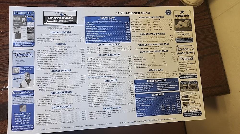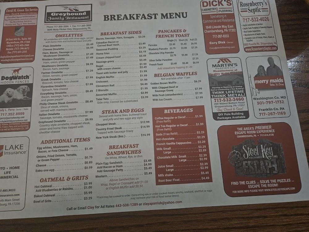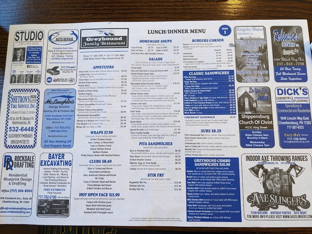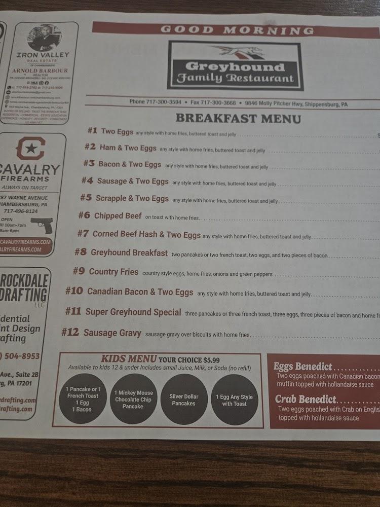 Welcome to Greyhound Family Restaurant, your go-to destination in Shippensburg for a delightful family dining experience. Nestled at 9846 Molly Pitcher Hwy, we offer a cozy atmosphere perfect for breakfast, lunch, or dinner. Enjoy our exceptional coffee, delicious desserts, and local specialties, all served with a smile. Our menu features simple, traditional dishes and healthy options, with shareable small plates ideal for groups. We accommodate all, with wheelchair accessibility and kid-friendly amenities. Whether you're here for a solo dinner or a family brunch, Greyhound Family Restaurant is dedicated to making your visit enjoyable. Reservations are welcome!